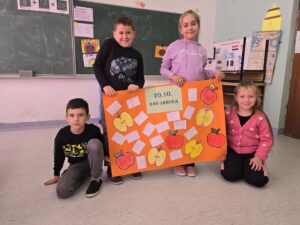 U ponedjeljak su, kroz predmetnu korelaciju, učenici 1.i 4. razreda sa svojom učiteljicom Jasminkom Stošić pjevali pjesmu „Evo nama jeseni“, izrezivali raznobojne jabuke iz papira i uređivali školski pano, smišljali pridjeve koji svojim početnim slovima daju riječ JABUKA, promatrali plod jabuke i crtali ju olovkom, gledali i komentirali prezentaciju o uzgoju različitih vrsta jabuka, te o važnosti ovog vrijednog voća za ljudsko zdravlje. Na kraju su jeli jabuke.
