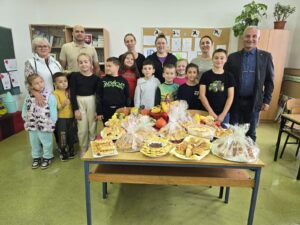 Petak je svim učenicima bio najdraži! Naše vrijedne mame i bake potrudile su se i za naše učenike ispekle svakojake pekarske delicije. Našlo se tu i vafli, peciva punjenih hrenovčicama, čokoladom, pekmezom, ali i malih predivnih kruščića. Ujedno je učiteljica Marina donijela domaće jabuke ubrane prethodni dan te je svim učenicima i učiteljima od njih radila domaći, zdravi, jabučni sok. Učenici su taj dan imali i vjeronauk pa su upoznali, uz pomoć vjeroučitelja Đore, i vjerski simbol kruha. Pjevali su pjesmu „Kruh naš dao si nam ti“, ali i crtali neobične kruhove.