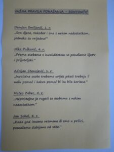 Razredna učiteljica Jasminka prezentirala im je digitalnu verziju slikovnice „BONTONČIĆ ili kako svima biti prijatelj” koja im je na ilustrativan način prikazala najpoželjnija ponašanja prema invalidima, ali ukazala i na ona nepoželjna koja svakako trebamo izbjegavati. I sami su, potom, izveli zaključke i ispisali svoja važna pravila o ponašanju prema invalidnim osobama.
