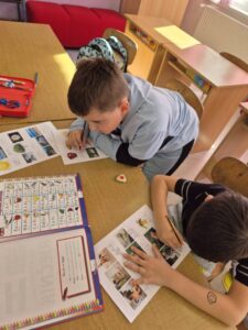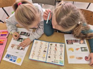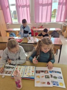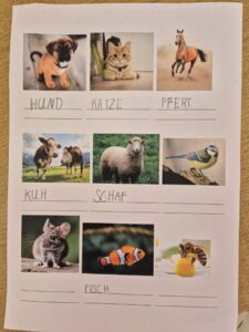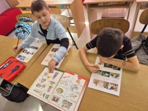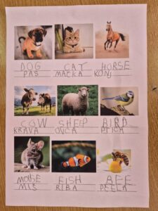Učenici su dobili nastavni listić sa slikama životinja, hrane, prirodnih pojava… Zadatak im je bio pronaći te pojmove u rječniku i napisati ih na stranom jeziku. Učenice Maja i Leona ispisivali su većinom njemačke nazive, dok su učenici Lukas i Ivan imenovali slike na engleskom jeziku.